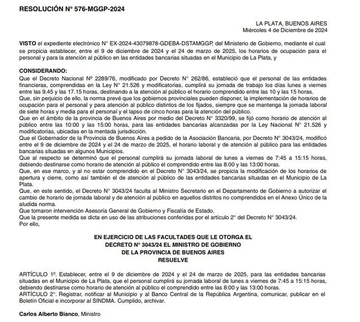 La medida quedó oficializada en la Resolución 576, que estableció que entre el 9 de diciembre y el 24 de marzo de 2025 las entidades bancarias de La Plata funcionarán entre las 7.45 y las 15.15. El horario de atención al público será de 8 a 13.