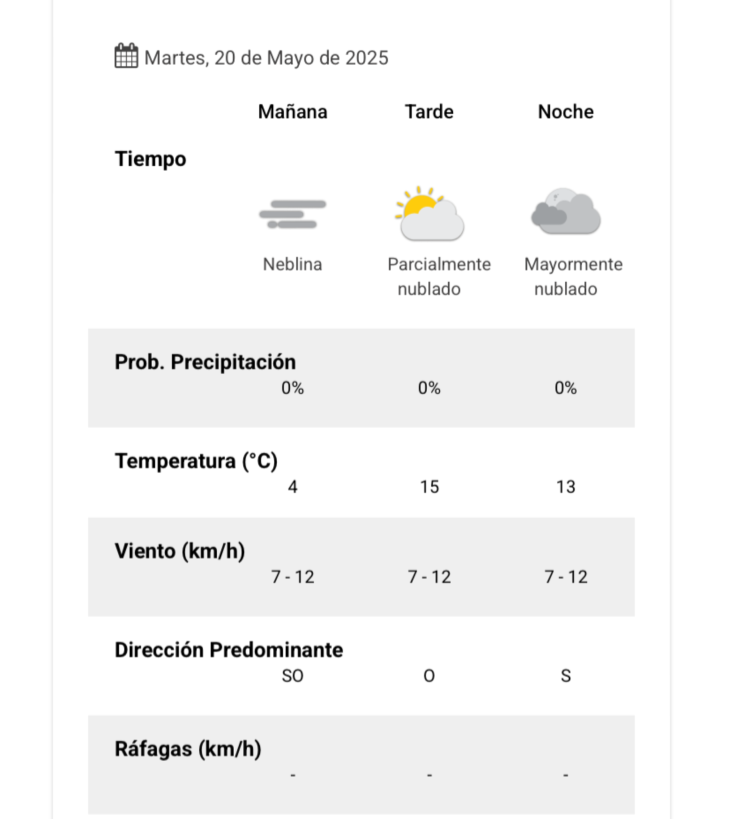 El fin de semana comenzará con el sábado con mínima de 11°C y una máxima de 17°C mientras que el domingo, 25 de mayo, será mínima de 13°C y máxima de 18°C.