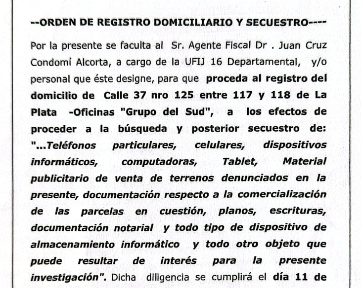 Según surge del expediente judicial, las medidas incluyeron allanamientos en oficinas de desarrolladoras urbanas, inmobiliarias y estudios notariales, tanto en La Plata como en la Ciudad de Buenos Aires, donde se ordenó el secuestro de documentación, computadoras, teléfonos celulares, dispositivos de almacenamiento y material publicitario vinculado a la venta de los lotes investigados.